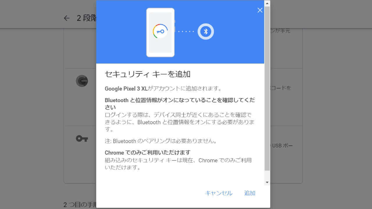 今回 Android が “セキュリティー キー” として利用できるようになったのですが、要は Bluetooth 型の「Titan Security Key」として利用できるようになりました。「2 段階認証プロセス」設定ページであらかじめ “セキュリティー キー” として登録をしておくことで、「2 段階認証プロセス」の際に Android のボリュームボタンを数回押すと「2 段階認証プロセス」のセキュリティロックを解除することができるようになります。