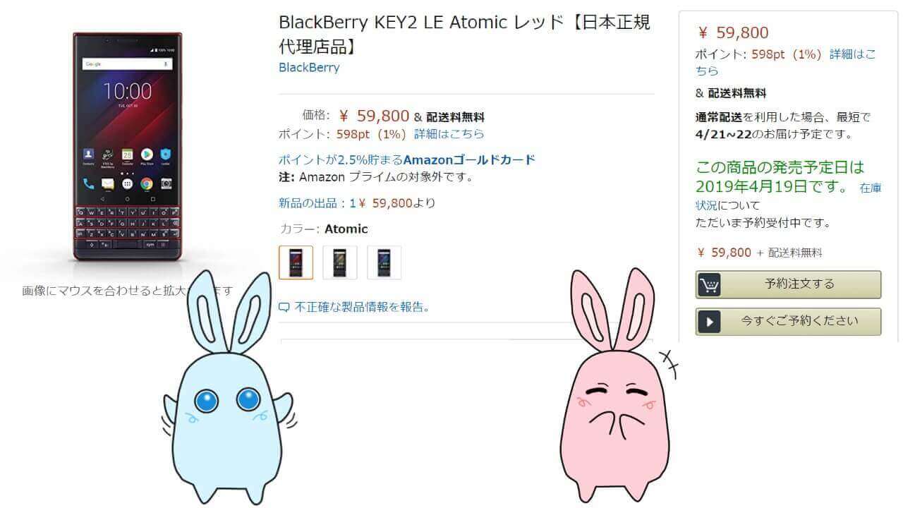 国内版「BlackBerry KEY2 LE」の価格は 55,370 円(税抜き)、税込み 59,800 円です。Amazon 価格も同じですが、更に 1% のポイント還元が付与されます。発売日は、4 月 19 日。
