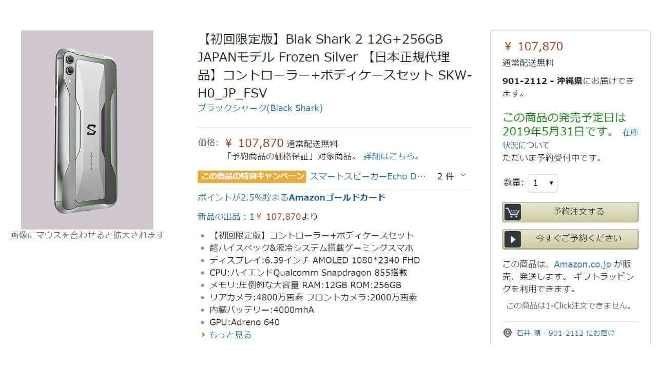 Amazon における国内版「Black Shark 2」の価格は、107,870 円です。しかも専用コントローラーとボディケースがバンドルされる、初回限定仕様。価格は高いですが、相対的にはお得です。