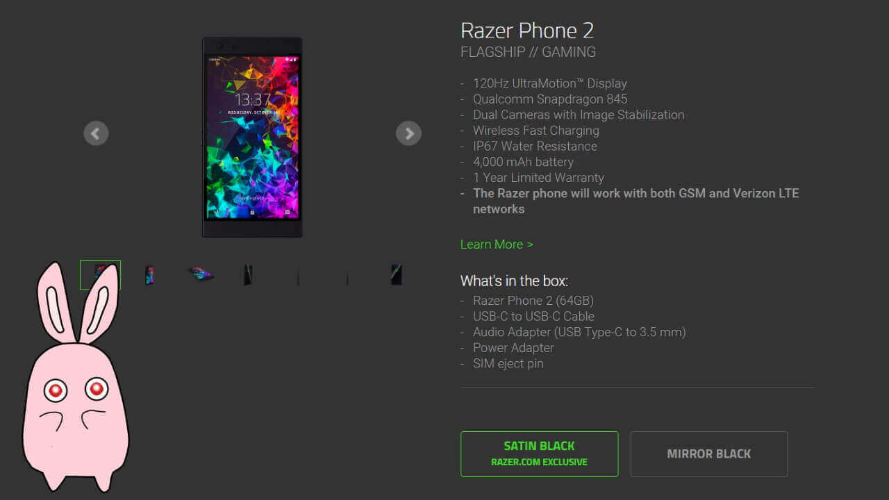 「Razer Phone 2」の価格は $799.99 で、2018 年 10 月 10 日より背面ガラスパネル仕様の “Mirror Black” が米国現地で予約が開始され、更に年末には欧州など向けのサテンモデル “Satin Black” が投入されます。ちなみに “Satin Black” は、本体価格 $899.99 です。