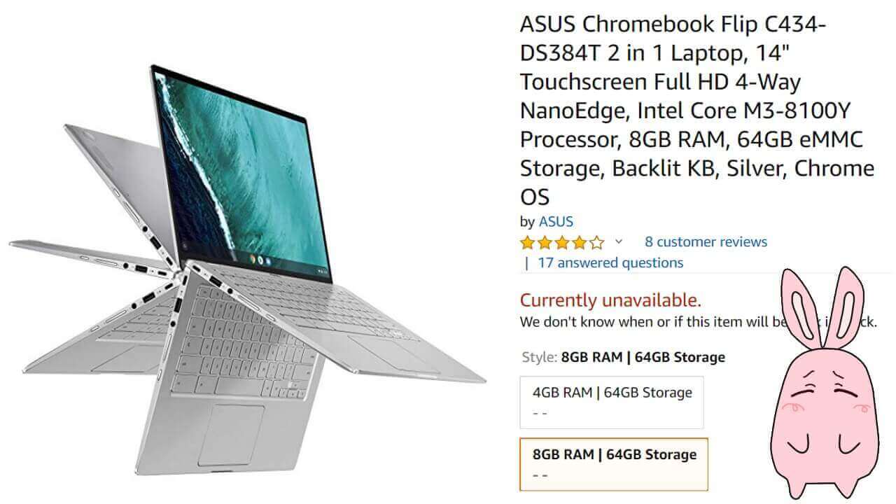ちなみに国内で発売された「Chromebook Flip C434」は、Core m3-8100Y プロセッサ + 8GB RAM + 32GB eMMC 搭載の型番「C434TA-AI0084」です。米 Amazon に新たに登場した型番「C434-DS384T」は、内部ストレージが多めとなっています。