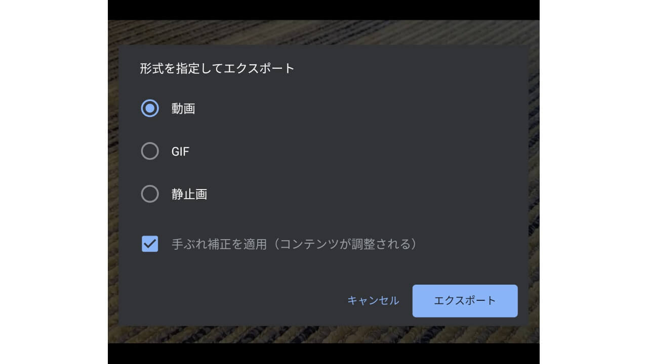また Android 版「Google フォト」アプリでは、モーションフォトを動画(MP4)、GIF アニメーション、静止画の 3 つのエクスポートメニューから選択してエクスポートすることも可能です。手ぶれ補正の有無も選択可能。
