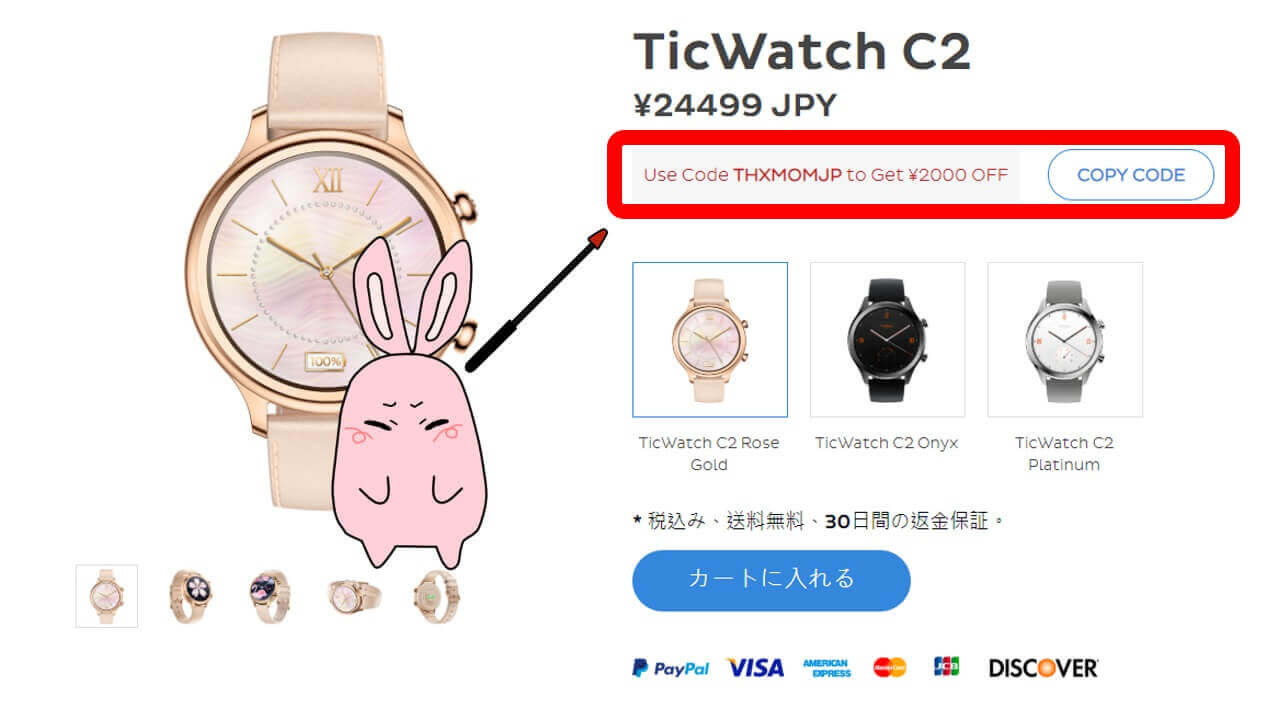 「TicWatch C2」の元値は、24,499 円です。現在は、20%(4,900 円)引きが適用され、送料と消費税込み 19,500 円となります。