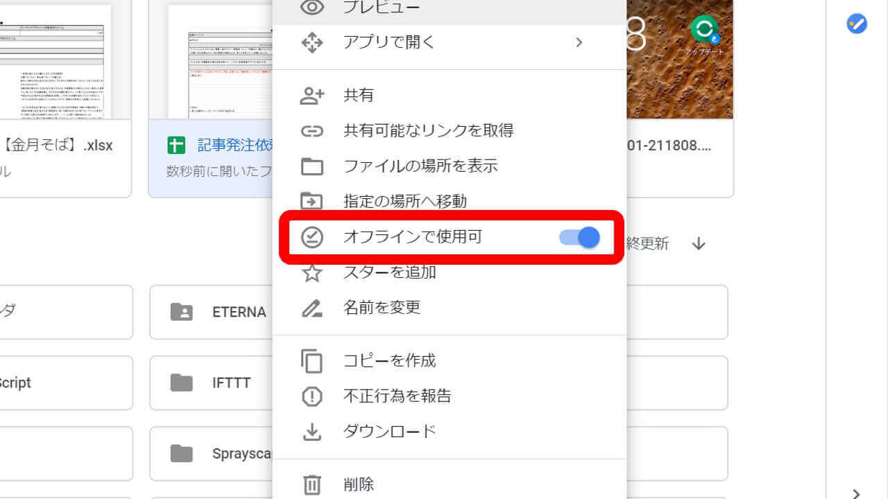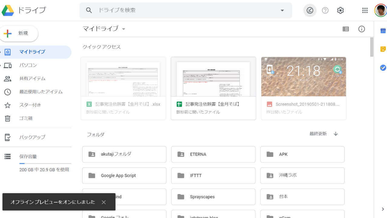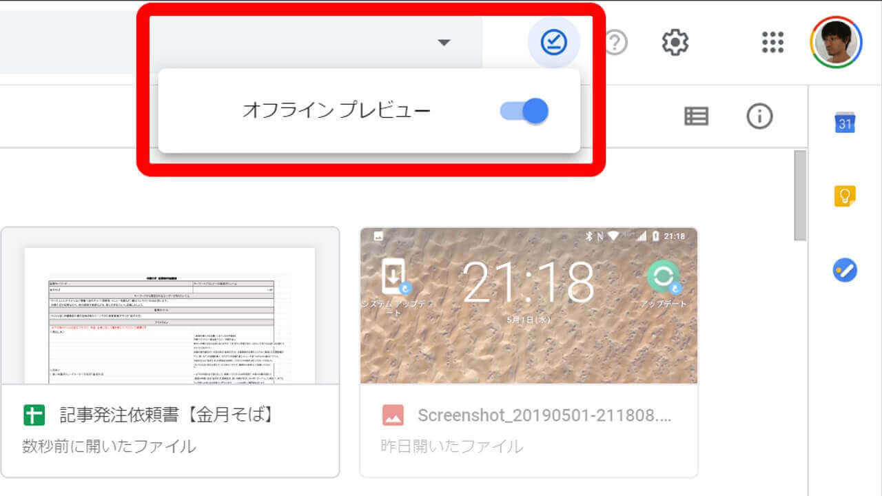 そしてこの “☑” アイコンから “オフライン プレビュー” を ON にすると、オフラインモードに切り替わります。オフラインモード中は、オフライン利用可能な「Google スプレッドシート」「Google ドキュメント」「Google スライド」以外のファイルを利用することができず、更に設定すらいじることができなくなります。