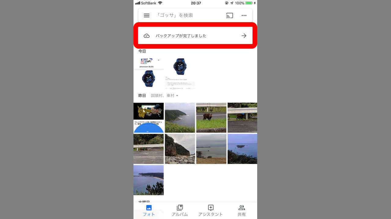 “バックアップ ビュー” を表示する手順は簡単で、「Google フォト」ライブラリ一覧画面の上部に表示される “バックアップしています” もしくは “バックアップが完了しました” をタッチして進むのみです。