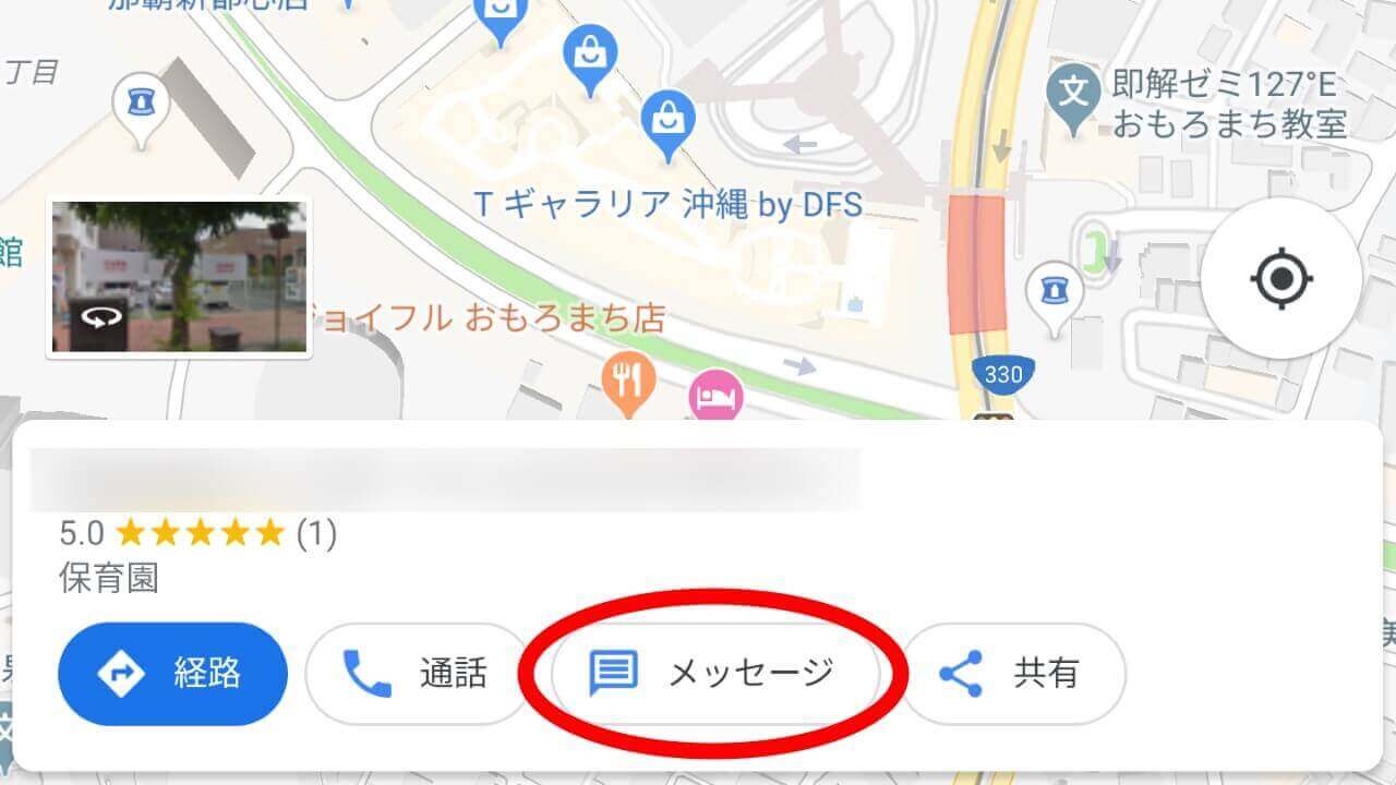 「Google マップ」の “メッセージ” を利用できる「Google マイビジネス」アカウントでは、“経路” や “共有” などのスポットメニューの並びに “メッセージ” が表示されます。そこをタッチすることで質問やコメントなどのメッセージをダイレクトにやり取りすることが可能。