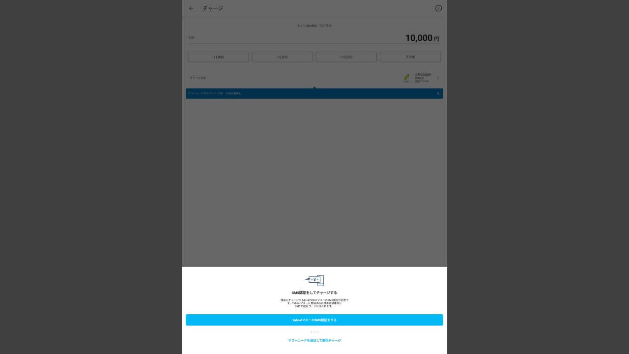 次に、「PayPay」にチャージします。こちらでは、銀行から 10,000 円チャージしました。初回チャージ時も、SMS 認証が必須。ご注意ください。