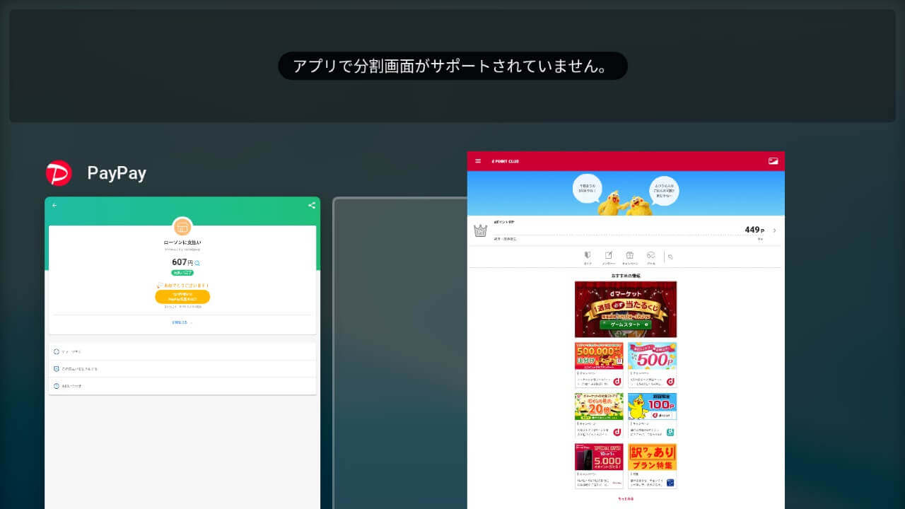 ちなみにですが、Chromebook タブレットの大画面で「d ポイント」と「PayPay」を分割で表示すればいちいちアプリを切り替える手間がないんじゃないか?と思ったのですが、「d ポイント」も「PayPay」も分割画面での表示非対応でした。これができたら更に便利なのに。
