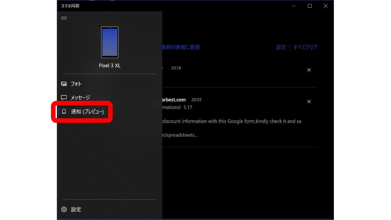 “通知(プレビュー)” では、Android で受信し通知バーに残っている通知が表示されます。ただし、Windows アプリの「スマホ同期」から通知にアクセスすることはできません。