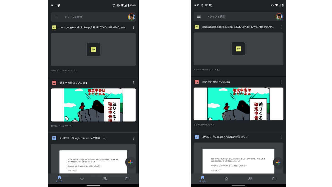 4 月上旬に確認していた「Google ドライブ」アプリのダークモードは、あくまでもランダムでした。手持ちの「Pixel 3 XL」でのみ、アプリを起動するとたまにダークモードが適用される程度。