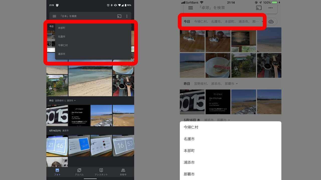 これまで撮影日付は “フォト” タブ内で自動グルーピングされ、撮影場所は検索バーに地名などを入れることでそれぞれ絞り込むことができたのですが、新たな絞り込み機能では、“フォト” タブ内の日付ごとのグルーピングに更に撮影場所一覧が表示されるので、そこから任意の場所をタッチすることで撮影日付と撮影場所を組み合わせた絞り込み表示が可能。またこの新機能は、Android と iOS アプリだけでなく、WEB 版「Google フォト」でも利用することができます。