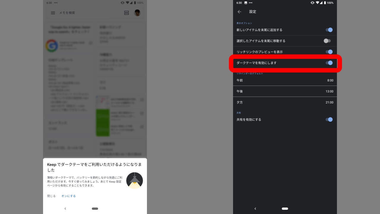 「Google Keep」アプリのダークモードは設定での ON / OFF も可能ですが、初回はポップアップが表示され、すぐにダークモードを適用できました。ダークモード適用後は、「Google Keep」アプリの設定から ON / OFF も可能です。