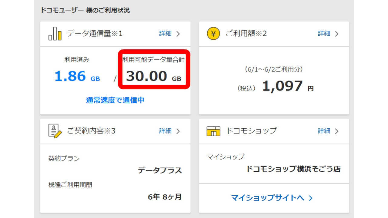 「データプラス」は契約(変更)が完了すると、即時適用となります。「My docomo」で見たら、こんな感じに。