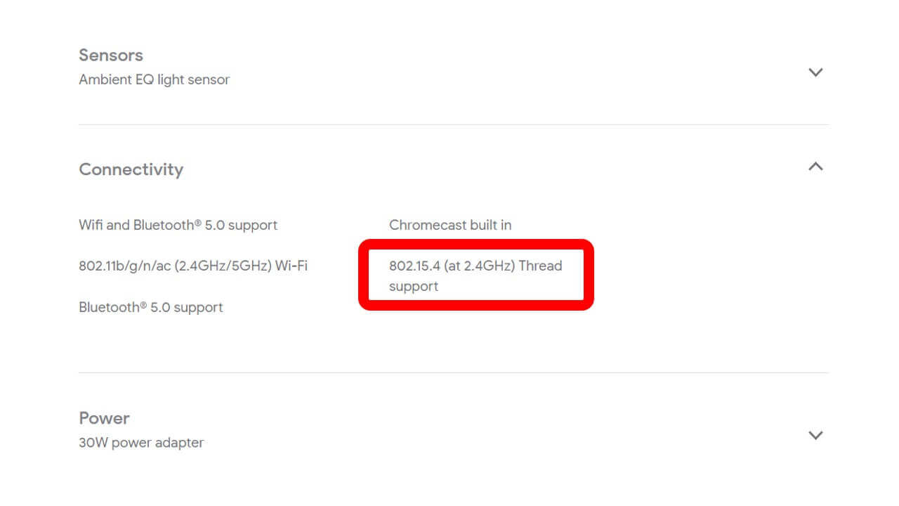 「Nest Hub Max」は「Nest Hub」の上位モデルで、サイズのほかにフロントカメラを搭載する点が異なるのみなのですが、今回更新され公開された「Nest Hub Max」ページの商品仕様より、「Nest Hub Max」が無線通信規格の「IEEE 802.15.4」をサポートする点も明らかとなりました。ちなみに「Nest Hub」は、「IEEE 802.15.4」未対応。「Nest Hub Max」が、シリーズ初の対応となります。