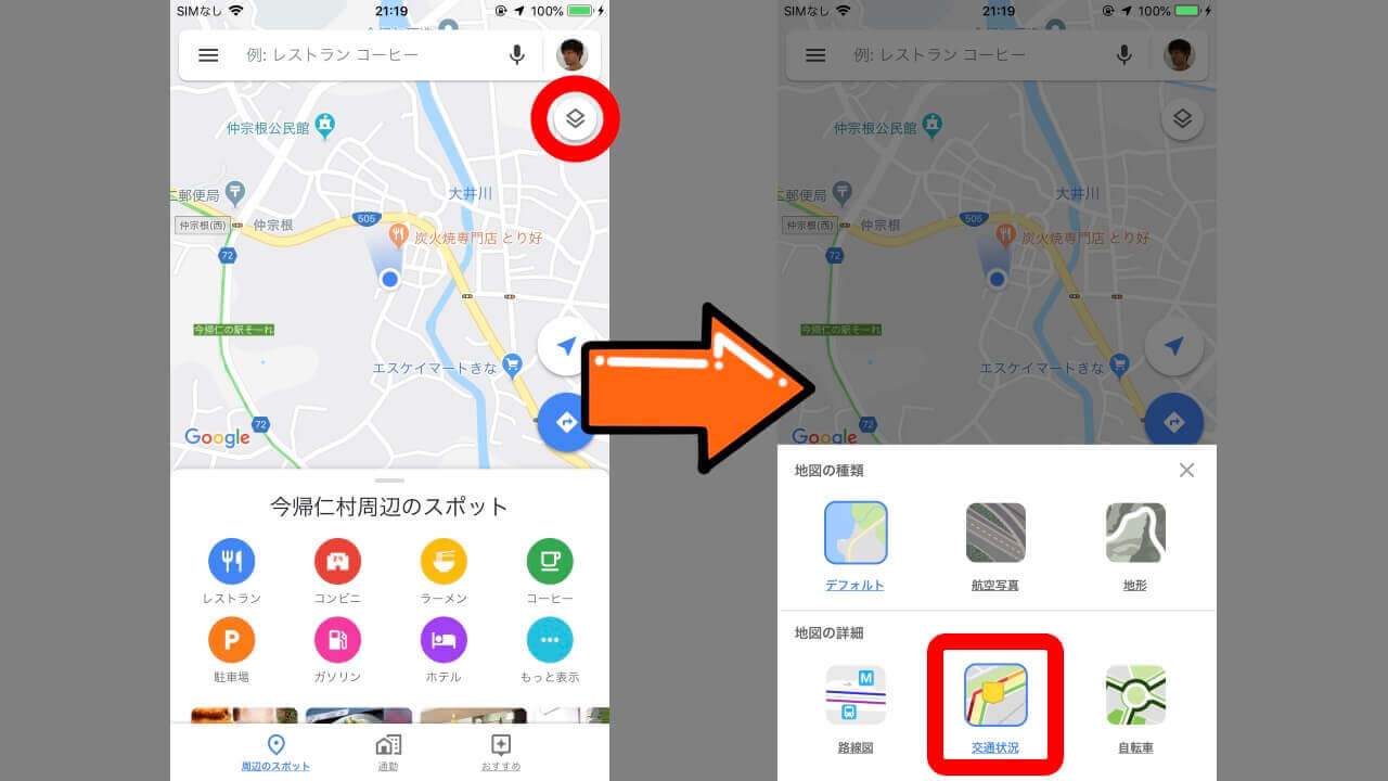 また Android 版「Google マップ」アプリには、この “渋滞状況” レイヤの動的表示が今のところはないので、こちらも今後どうなるのか注目です。ちなみに「Google マップ」アプリの “渋滞状況” レイヤは、レイヤアイコンから切り替え可能です。