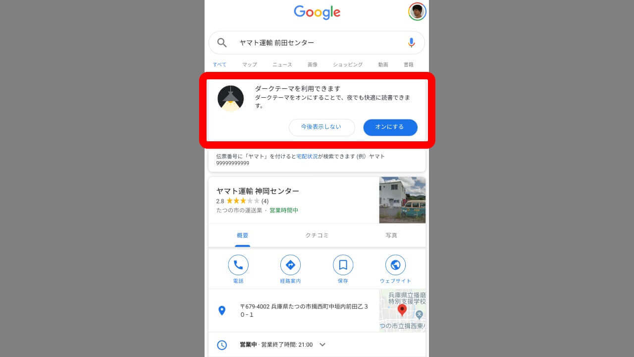 Android「Google」アプリのダークモードはアプリのアップデートで提供されているわけではなく、最新版アプリをインストールしている状態であれば自動で利用できるようになる模様。実際には「Google」アプリで検索を行った際に、検索ページにダークモードの利用を促すカードが表示されます。