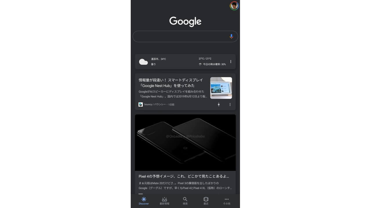 Android「Google」アプリのダークモードは、検索結果のほかに「Google Discover」ページにも反映されます。