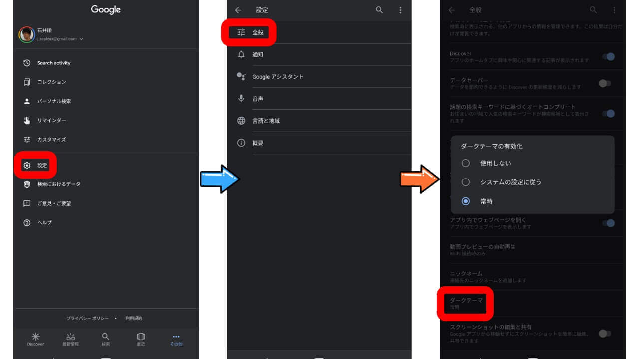 また Android「Google」アプリのダークモードは、設定で ON / OFF が可能。設定では、“使用しない” “システム設定に従う” “常時” の 3 つから選択可能。