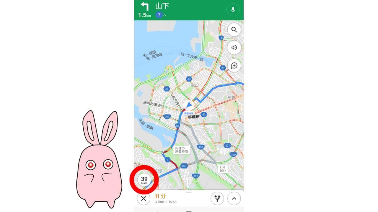 Android「Google マップ」アプリのスピードメーターは、リアルタイムにスピード測定をしてくれる仕様です。恐らく GPS を活用した移動距離と時間から速度を算出している仕様なので、リアルタイムな速度とは若干の誤差(時速 2 ~ 3 km 程度)は生じますが、ほぼ実際の車のスピードメーターと変わらない数値となりました。