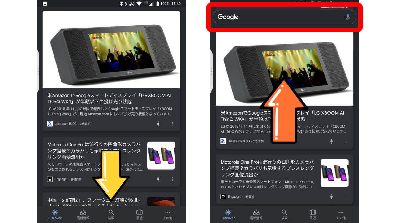 これまで「Google Discover」ページの検索バーはページトップに設置されていて、ページを下にスクロールした場合は完全に隠れる仕様だったのですが、Android 版「Google」v10.12.1 では下にスクロールした場合は検索バーが隠れるものの、上にスクロールしてページを戻る操作をした場合に、検索バーがヘッダーに固定された状態で表示されます。つまり、「Google Discover」ページを確認しているときに検索バーを利用する場合、ページトップまで戻る必要がなくなったということ。とてもちっちゃな改修です。