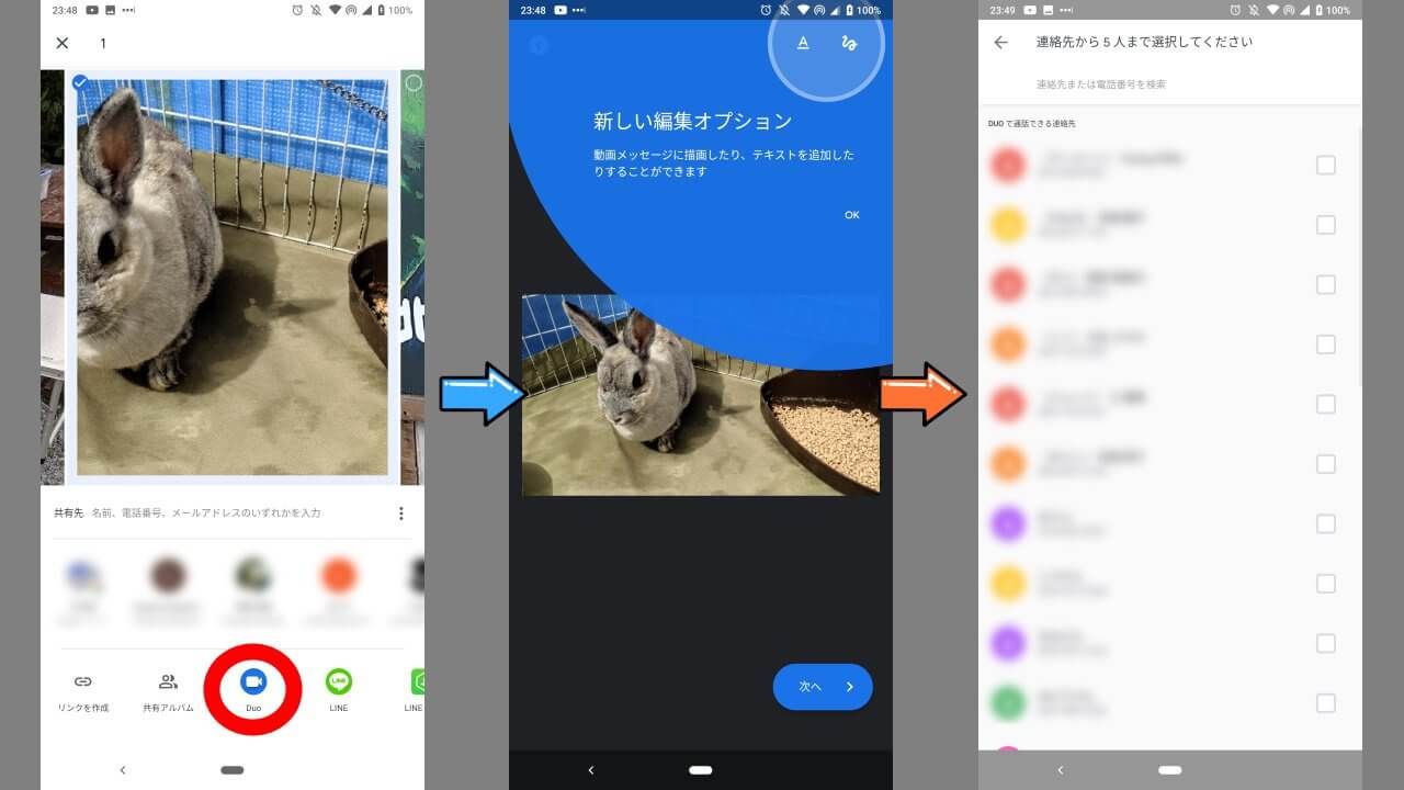 画像の編集が完了したら、いよいよ共有です。「Google Duo」を利用している最大 5 名までのユーザーに、同時に画像を共有することができます。