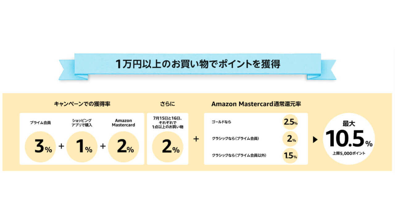 今年の「Prime Day」では、期間中に 10,000 円以上の買い物をした場合に、Amazon ポイントが最大 10.5% 還元される「Amazon ポイントアップキャナンペーン」も行われます。