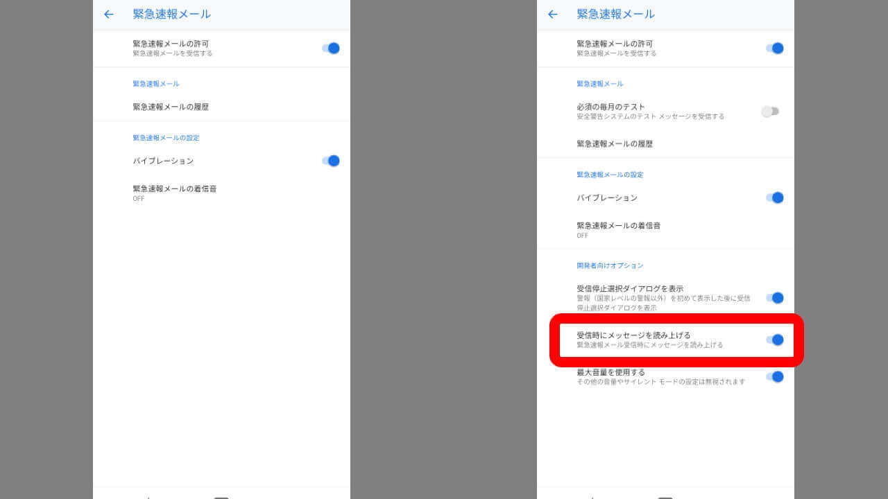 で、機種ごとの「緊急速報メール」の設定をみたところ、“受信時にメッセージを読み上げる” の設定がある機種とない機種を発見。なぜ、“受信時にメッセージを読み上げる” の設定がある機種とない機種があるのかちょっと疑問に思いつつもしやと思って調べてみたら、その謎が簡単に解決しました。