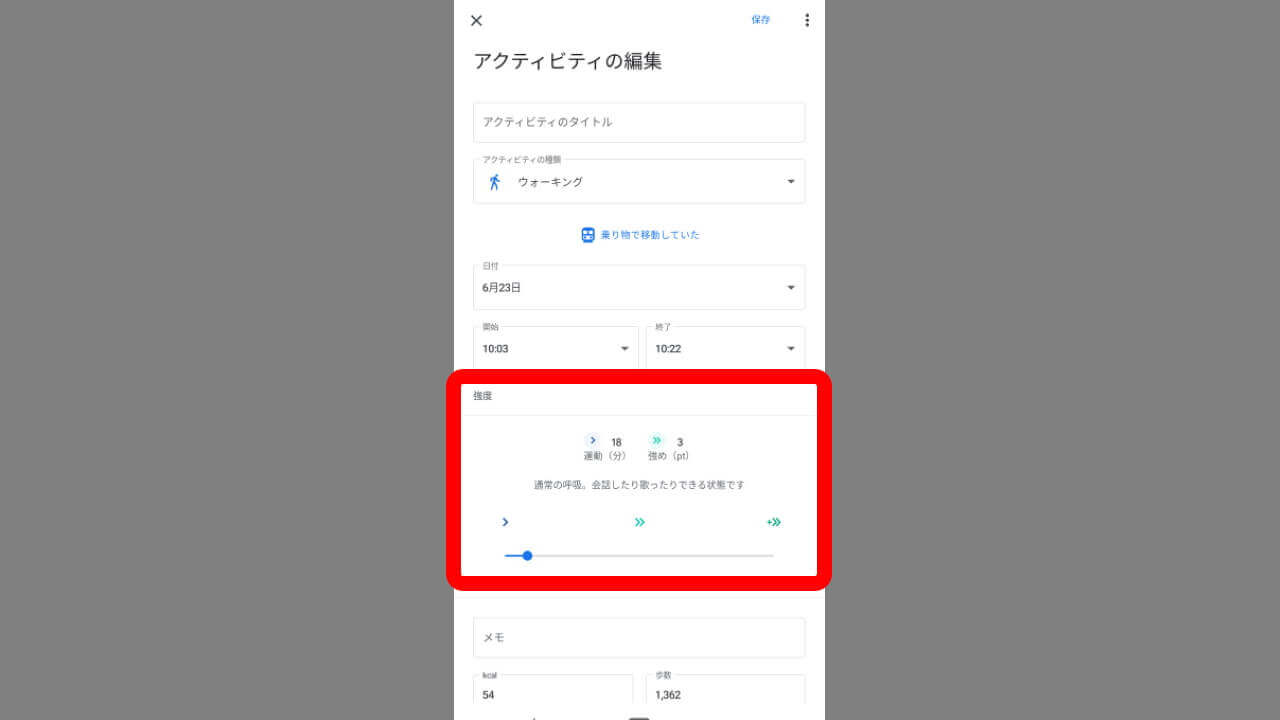 自動で記録された運動の時間と強度を編集できる機能はその名の通りで、自動記録された日々のアクティビティから算出される “通常の運動(分)” と “強めの運動(ハートポイント)” から日付を選択して、“アクティビティの種類” “時間” “強度” “消費熱量(kcal)” “歩数” “距離” などを編集することができます。運動を追加するよりは、実は乗り物に乗っていたなどの誤って記録されたアクティビティを修正する用途などに役立つ機能です。