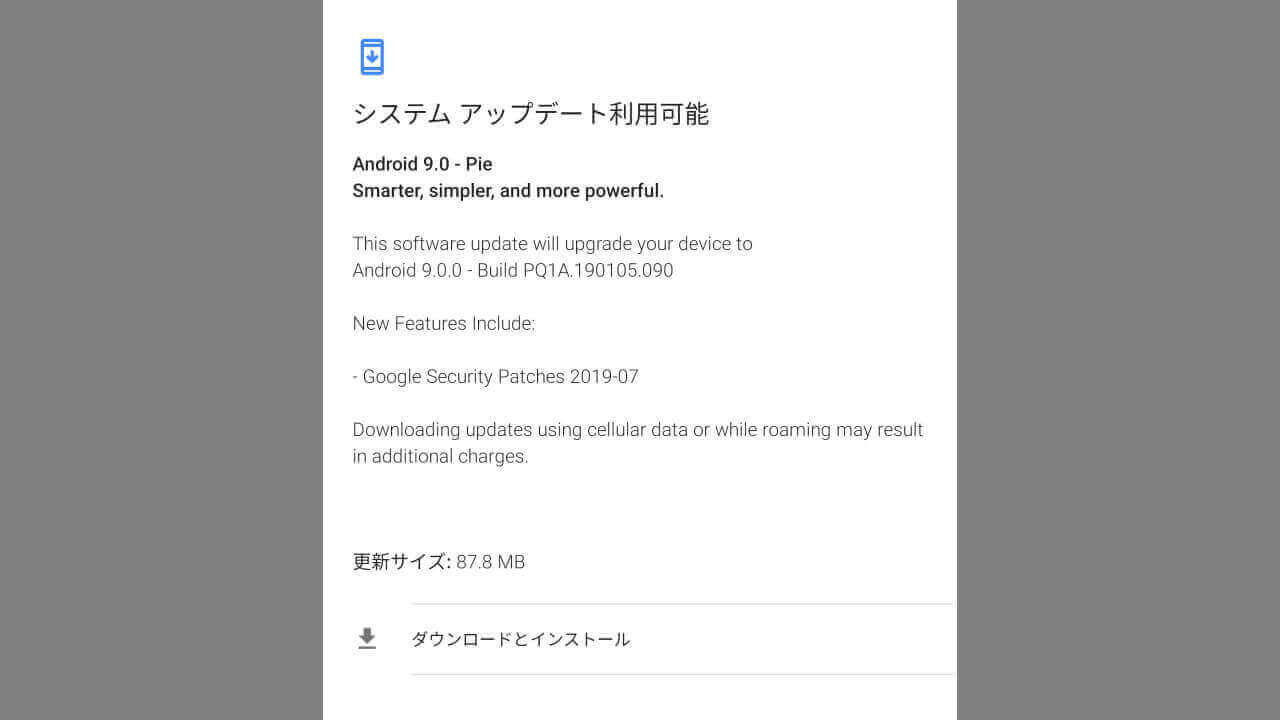 アップデート後は、Android セキュリティパッチレベルが 2019 年 7 月 1 日に更新されます。アップデート後のビルド番号は、「Build PQ1A.190105.090」です。