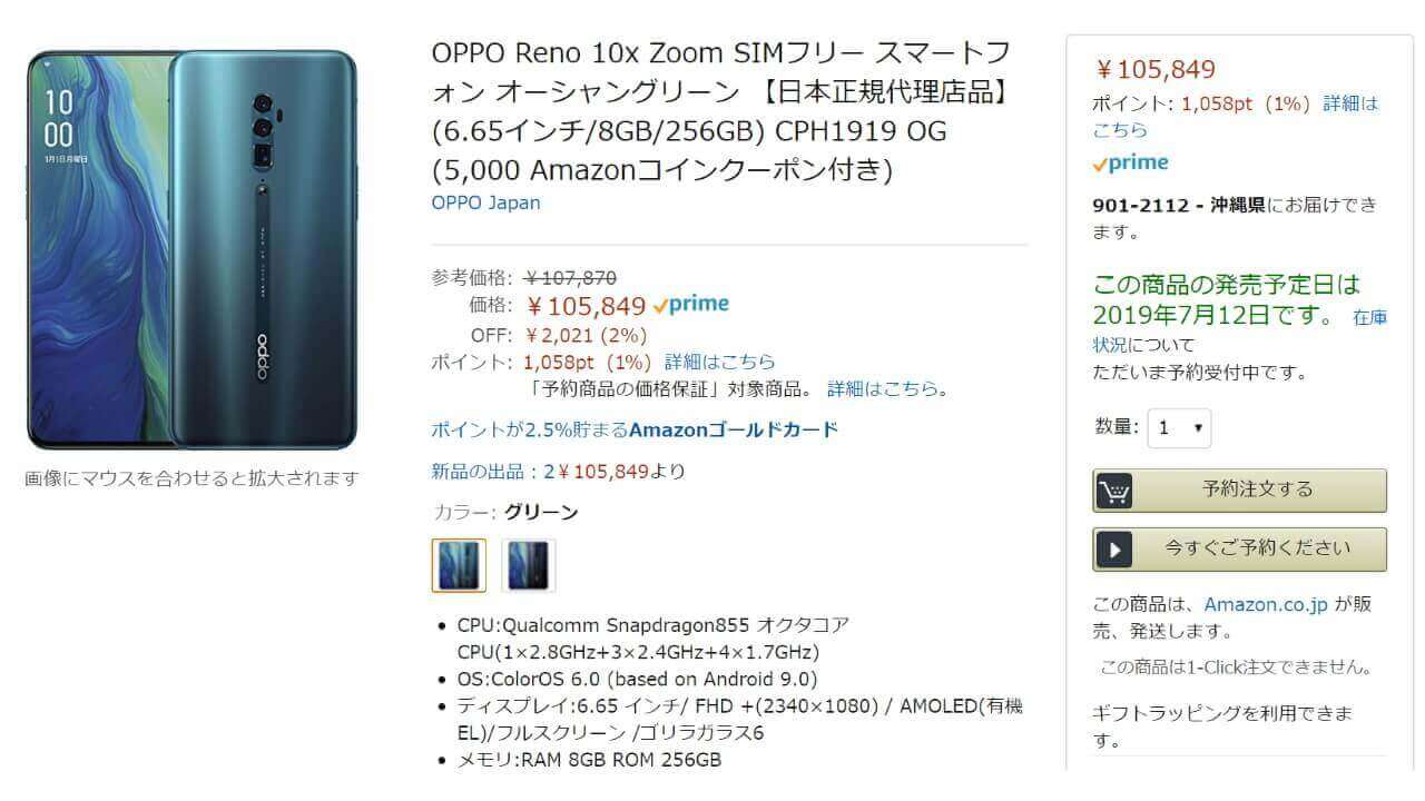 2019 年 7 月 12 日に国内発表される OPPO の新型ハイスペックスマートフォン「Reno 10x Zoom」ですが、絶賛予約中の国内 Amazon.co.jp にて、更にお得となりました。
