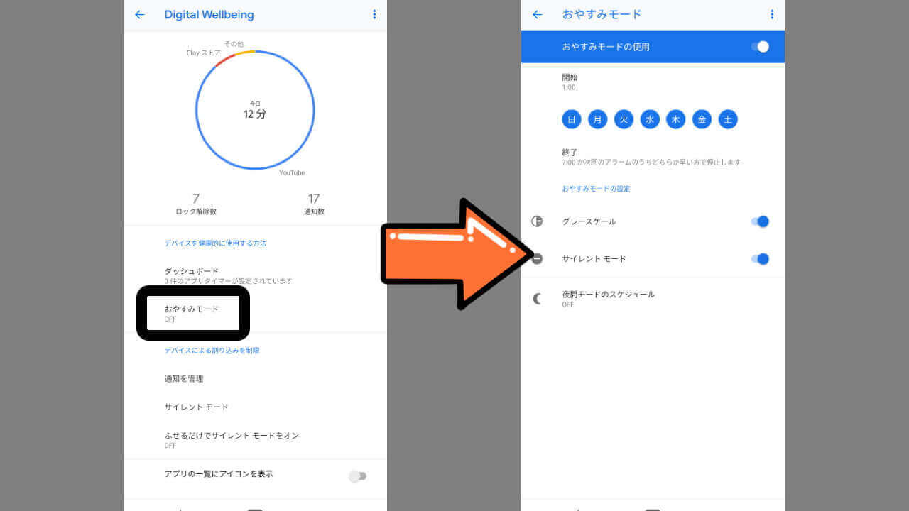 「Digital Wellbeing」の “おやすみモード” は就寝している時間帯などを予め設定しておくことで、サイレントモードやディスプレイ画面のグレー表示など、深夜に特化した設定に切り替えることができるサイレント設定です。“おやすみモード” は手動で ON / OFF もできますが、開始時間と終了時間を設定しておくことで、その時間になると自動で設定が ON になります。