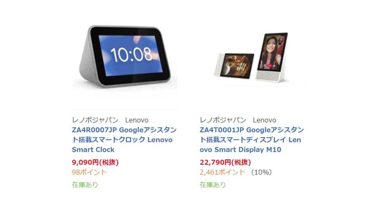 ちなみにビックカメラでは、「Lenovo Smart Display M10」が 10% ポイント還元、「Lenovo Smart Clock」が 1% ポイント還元となっています。