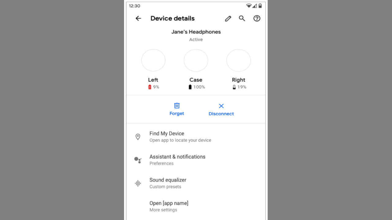 これらの機能は次期 Android OS バージョン「Android Q」にて、更新された Bluetooth デバイス詳細情報画面が提供される模様で、そこから左右それぞれとバッテリーケースのバッテリー残量や「Find My Device」が利用可能となります。