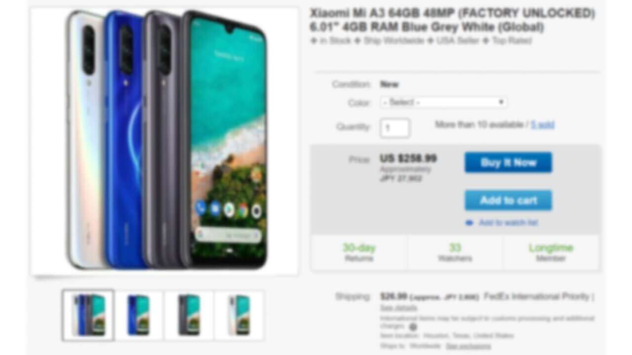 今回ご紹介する「Xiaomi Mi A3」64GB 内部ストレージ搭載モデルの ebay 出品概要です。