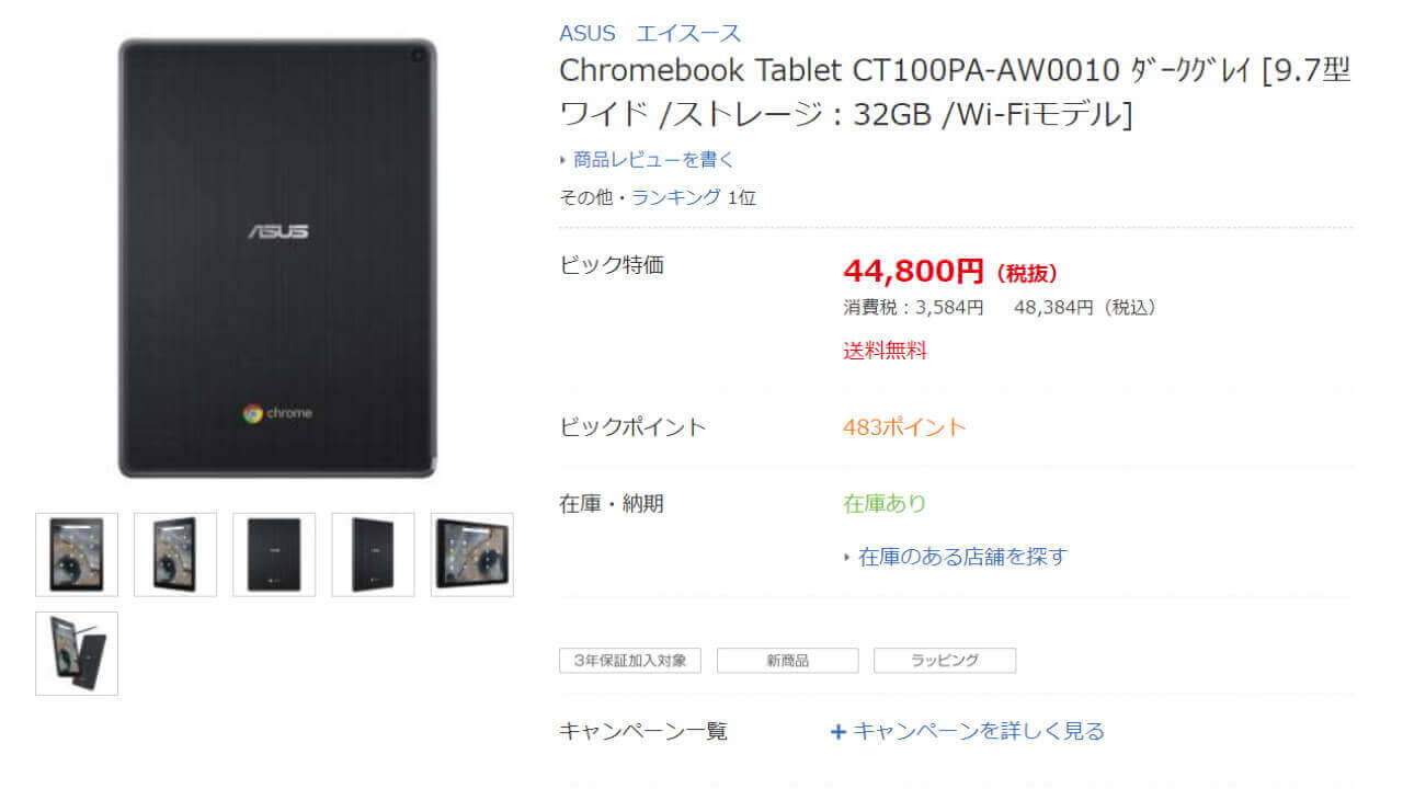 ビックカメラにおける「Chromebook Tablet CT100」の価格は、44,800 円(税抜き)+ 1% ポイント(483pt)還元です。