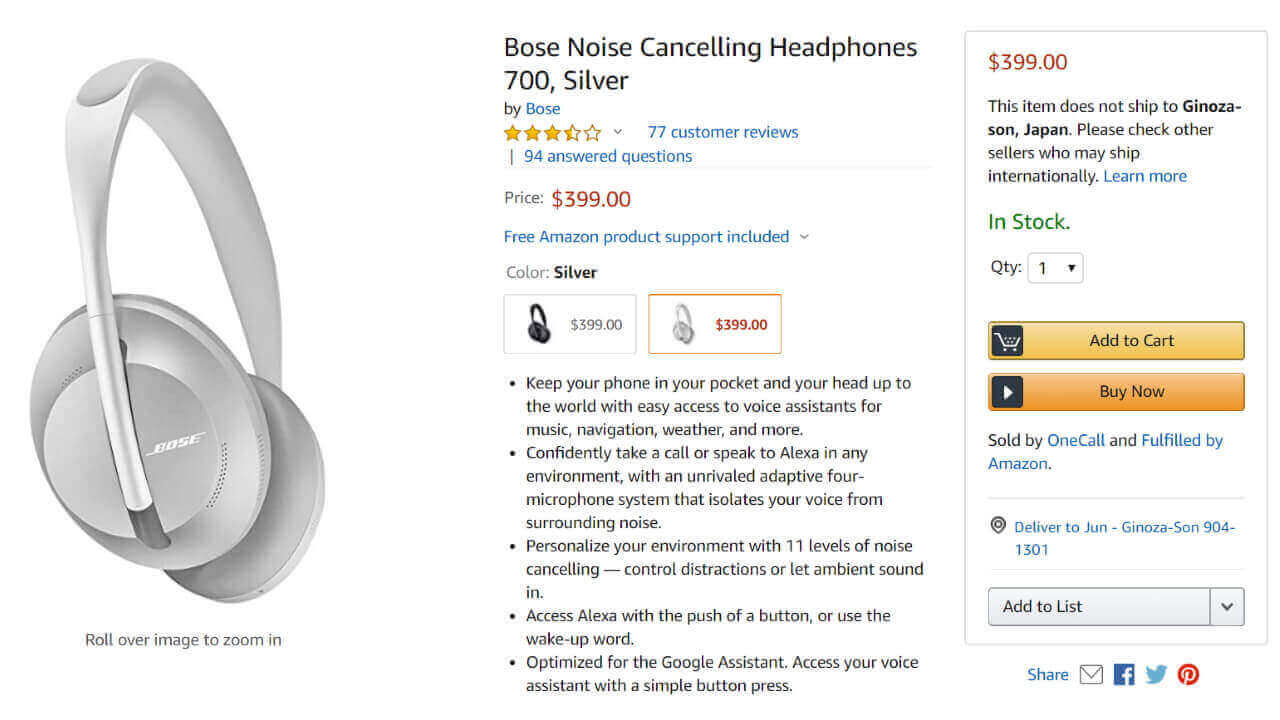 「Bose Noise Cancelling Headphones 700」の価格は、$399.00 です。転送輸入必須です。