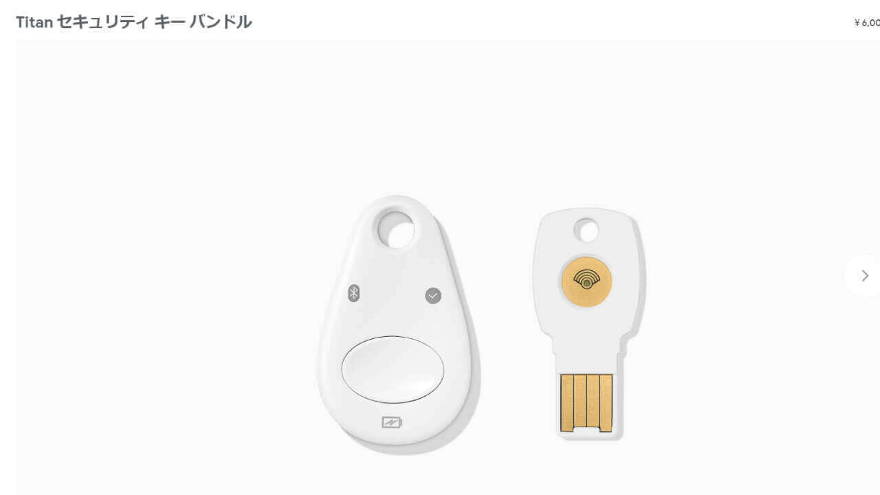 「Titan セキュリティ キー バンドル」は、Google の 2 段階認証用セキュリティーキーで、例えばスマートフォンで Google アカウントにログインする際の 2 段階認証時に Bluetooth キーのボタンを押すことで、2 段階認証がアンロックされてログイン可能となります。
