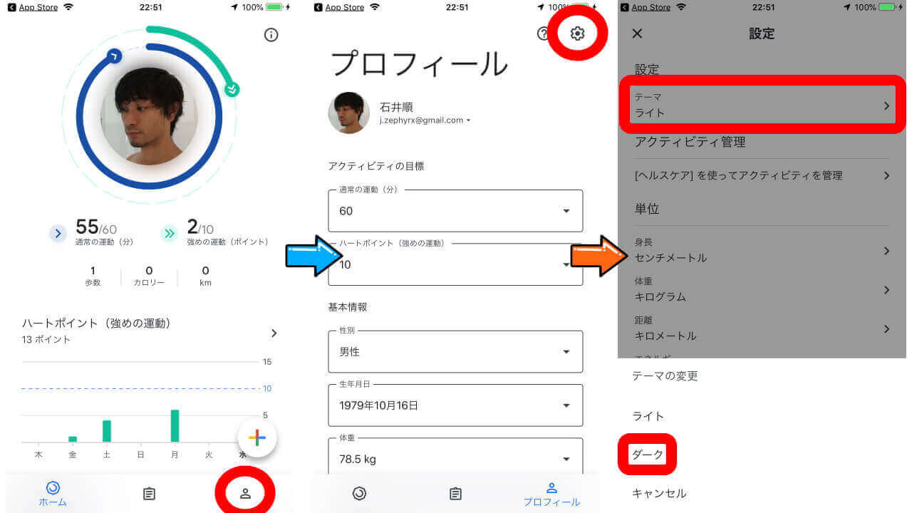 実際の iOS 版「Google Fit」のダークテーマ設定は、設定項目の “テーマ” から “ダーク” を選択するのみです。