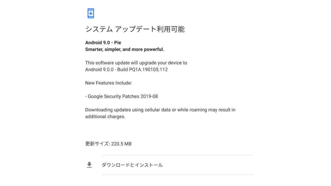 今回のソフトウェアアップデートも、先月同様 Android セキュリティパッチレベルの更新のみです。ただし、アップデート用ファイルのサイズは 220.5MB と少し大き目。