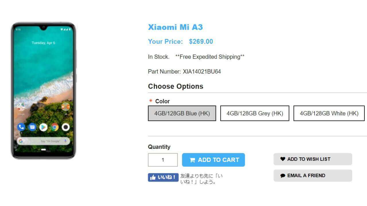 日本語と日本直送に対応している香港のガジェットショップ 1ShopMobile に、Xiaomi の Android One スマートフォン第 3 弾「Mi A3」が入荷しました。