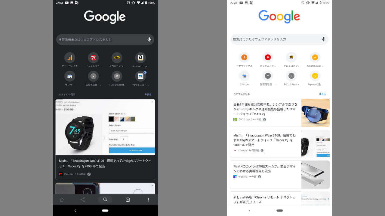そんな「Google Discover」は基本的に、「Google」アプリや「Chrome」アプリのホーム画面に一覧表示されるようになっているのですが、「Google」アプリではコンテンツによって大きい画像が用いられてカード表示される一方で、「Chrome」アプリでは一律で小さいサイズの画像が用いられて一覧表示されてきました。しかし Android 版「Chrome Beta」v77 において、ついに「Google」アプリと同じく大きい画像が用いられるようになりました。