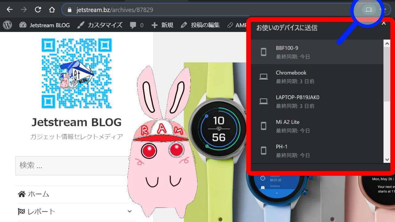 その実際の方法は、アドレスバーに表示されているコンテンツ送信アイコンをクリックして、送信するデバイスを選択するというもの。簡単です。ちなみに送信可能なデバイスは、デスクトップ側と同じ Google アカウントでログインしている「Chrome」を利用できる機種です。