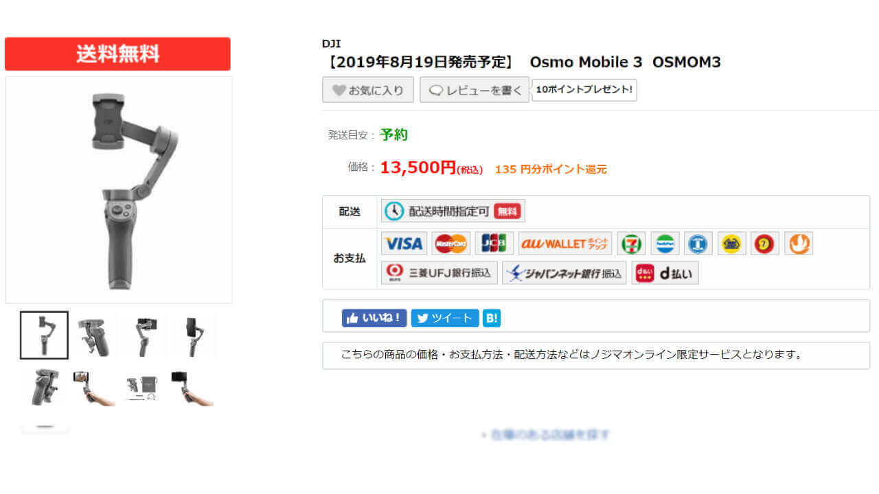 これにより、よりいろいろな店舗や販売チャネルで「Osmo Mobile 3」を購入できます。ちなみに予約開始当初は 10% ポイント(1,350pt)還元付きで予約を行っていたノジマ電機は、現在は 1% ポイント(135pt)還元に代わっています。