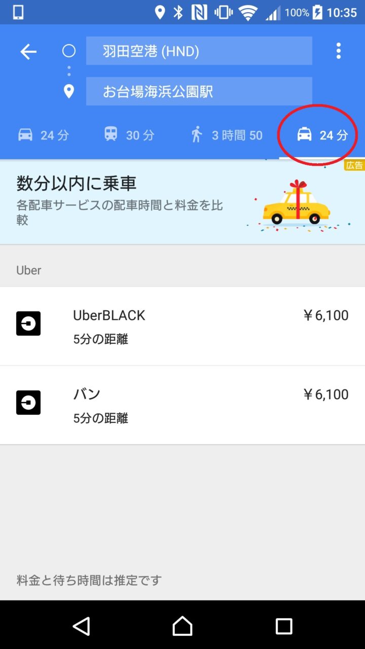 使い方は簡単で、通常通り経路検索を行った際の移動手段部分に表示される一番右の “Uber” アイコンをタッチするのみです。