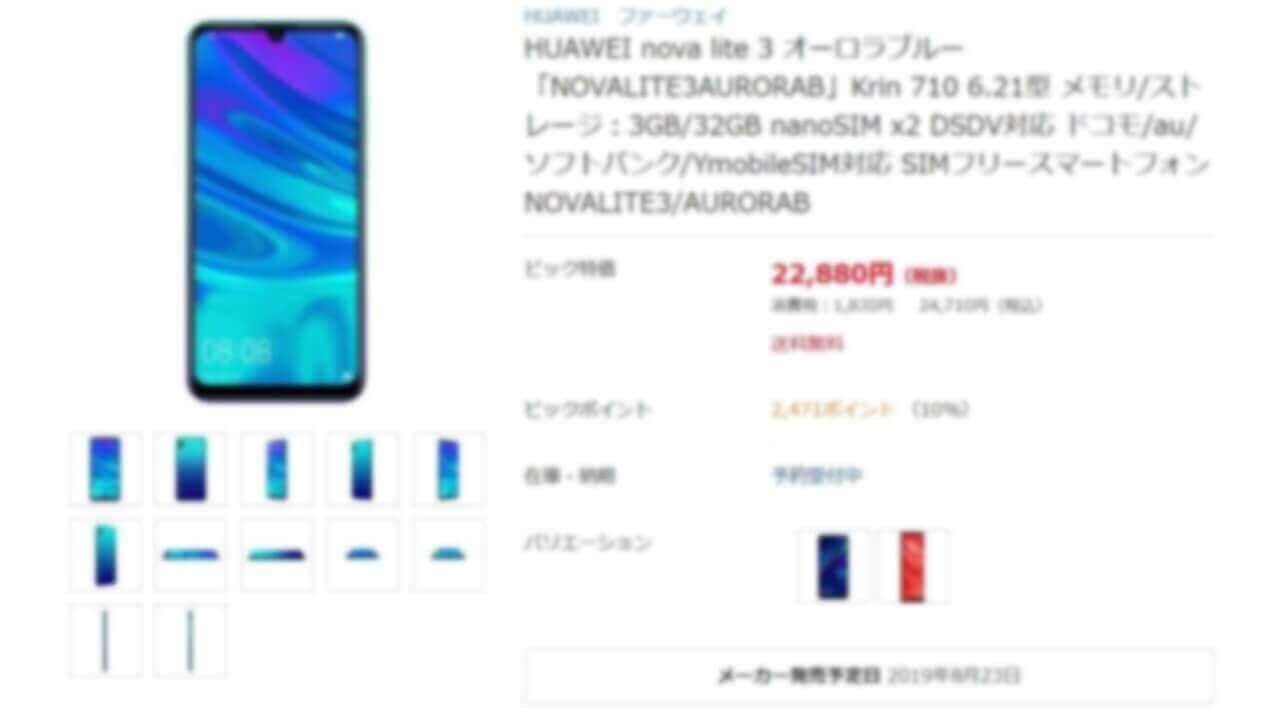 - 「Huawei nova lite 3」2019 年 8 月 23 日単体発売
