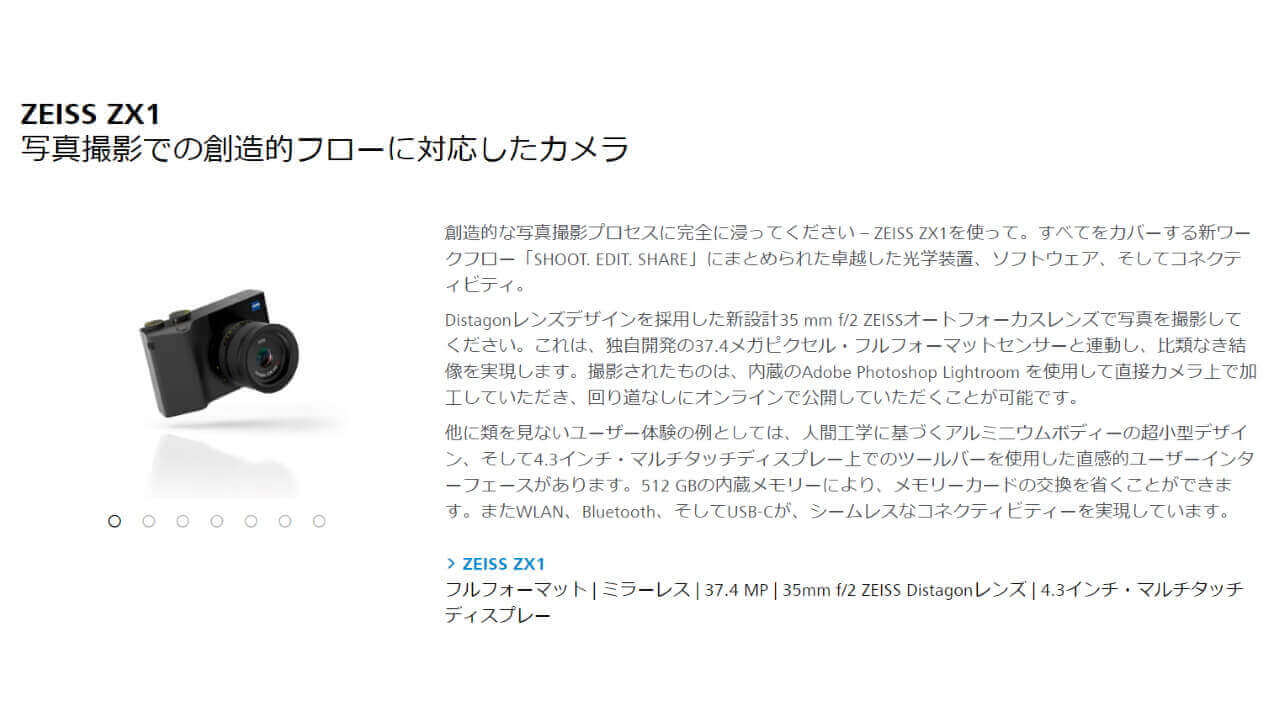 「ZEISS ZX1」は、3,740 万画素の ZEISS Distagon レンズを採用するコンパクトデジタルカメラです。