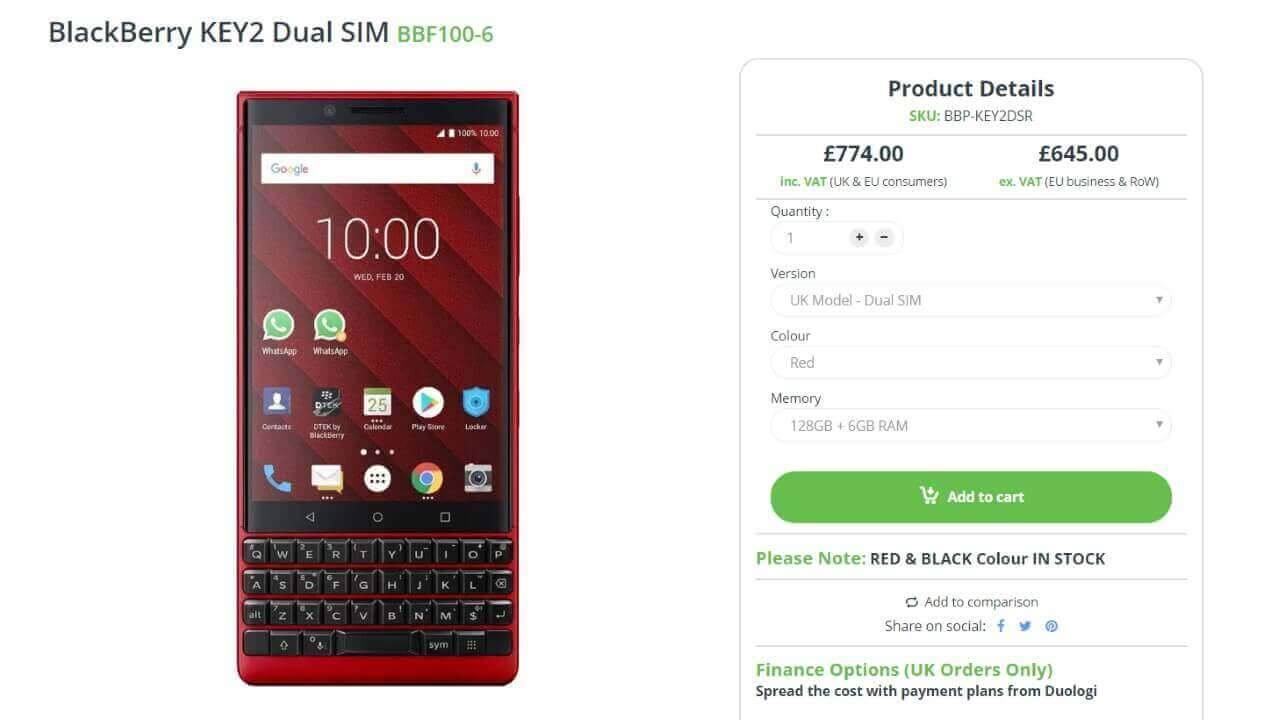 Clove における「BlackBerry KEY2 Red Edition」の価格は、VAT 抜き £645.00(約 83,350 円)。高めです。