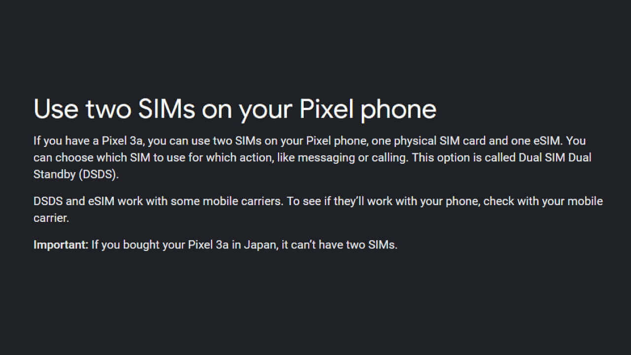 このほか、海外モデルでも「Pixel 3」「Pixel 3 XL」も eSIM を活用した「DSDS」はサポートされていない模様です。