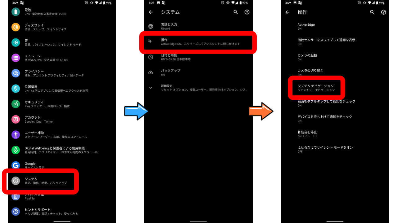[ジェスチャー ナビゲーション]を ON にする設定は簡単です。
