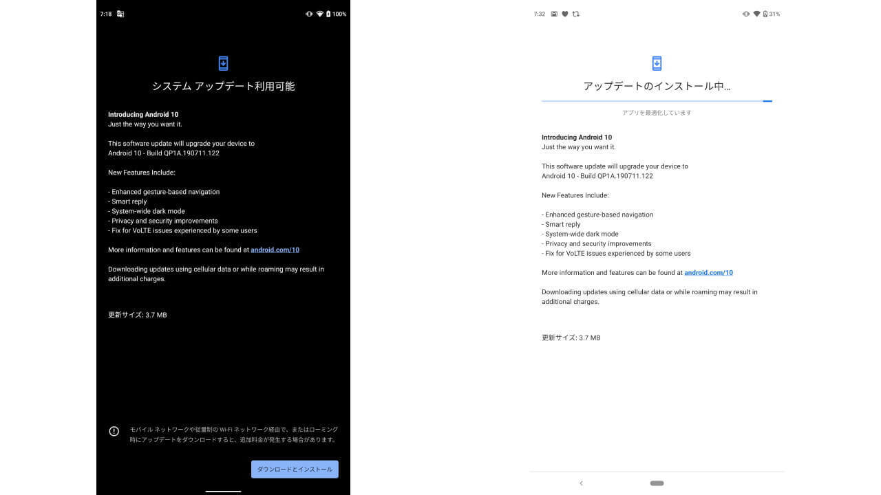 アップデート用ファイルサイズは 3.7MB で、アップデート後のビルド番号は「QP1A.190711.122」です。